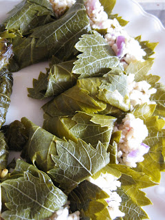 Silppua sipuli pieneksi, murenna fetajuusto ja sekoita ne riisin kanssa hyvin sekaisin. Mausta seos oreganolla ja mustapippurilla ja lisää oliiviöljyä. Viruta ja kuivaa viiniköynnöksen lehdet ja aseta ne lehtiruodit ylöspäin. Lusikoi jokaisen lehden päälle hieman täytettä ja taita rullalle. Tarjoile tsatsikikastikkeen kanssa.